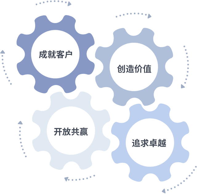 成就客户是一切决策的出发点,,,,创造价值是衡量所有工作的标准,,,追求卓越是我们做事做人的态度,,开放共赢是我们的格局也是最终的结果。。。价值观的齿轮环环相扣,,推动着组织里的每个人不断向前。。。